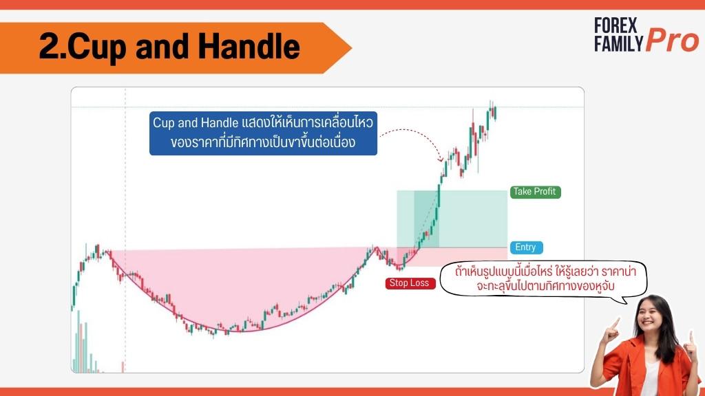 - ให้จำง่ายๆ ว่าลักษณะจะเหมือนกับถ้วยชาบนกราฟ แสดงให้เห็นการเคลื่อนไหวของราคาที่มีทิศทางเป็นขาขึ้นต่อเนื่อง