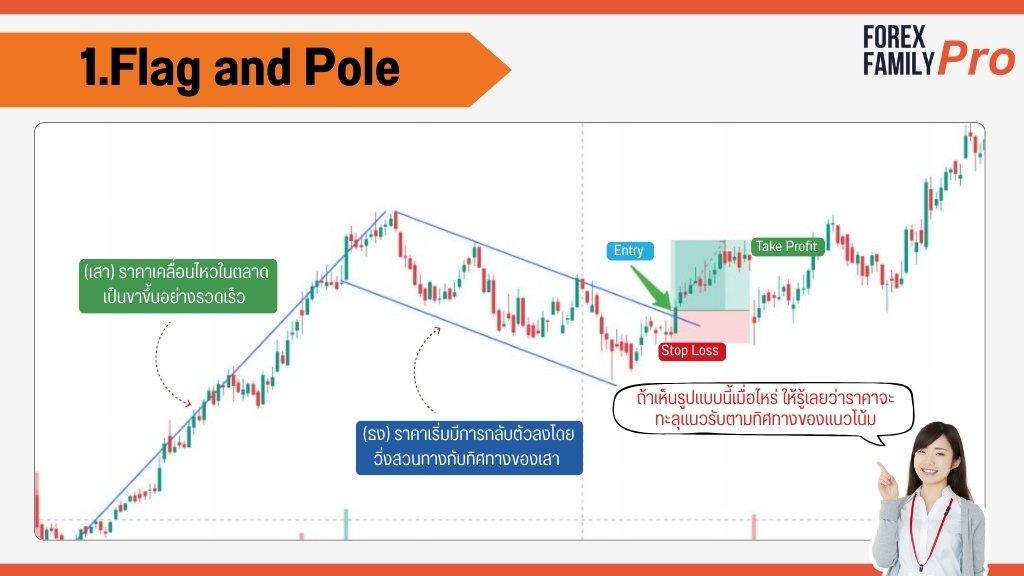 - หรือจะเรียกอีกว่ารูปแบบธงและเสาธงก็ได้ มักเกิดขึ้นตอนที่ตลาดมีแนวโน้มที่แข็งแกร่ง
